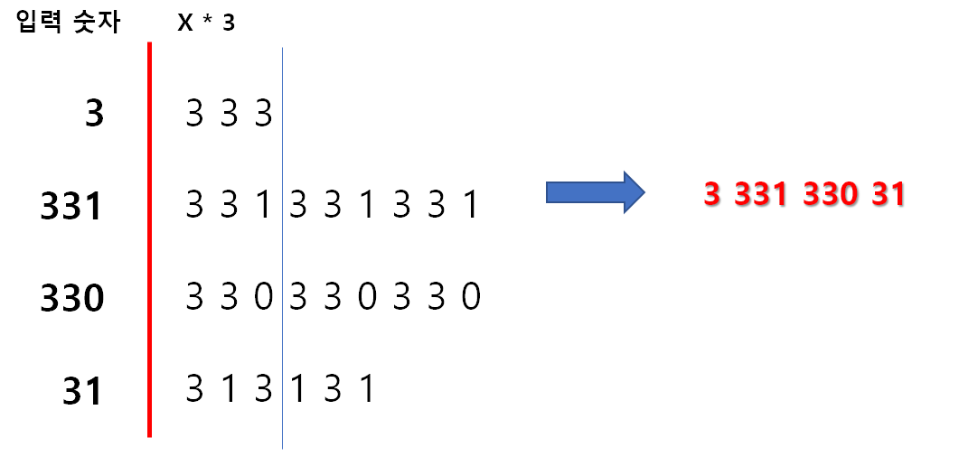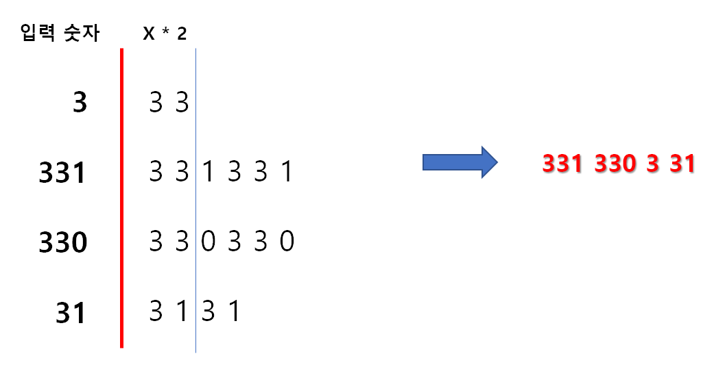 주어진 값의 3과 331을 비교했을 때, 만약 x * 2를 했다면 3은 33이 되지만 331은 331331이 됩니다.