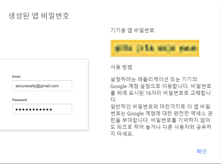생성 버튼을 누르면 기기용 앱 비밀번호를 발급해 줍니다.