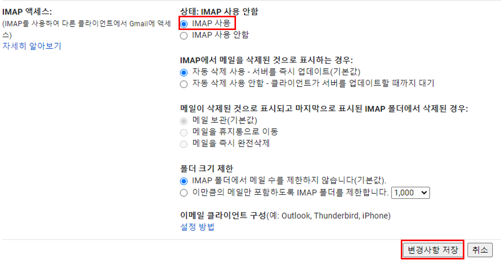 IMAP 액세스 항목에서 "IMAP 사용"으로 상태를 변경하고 저장 버튼을 누릅니다.