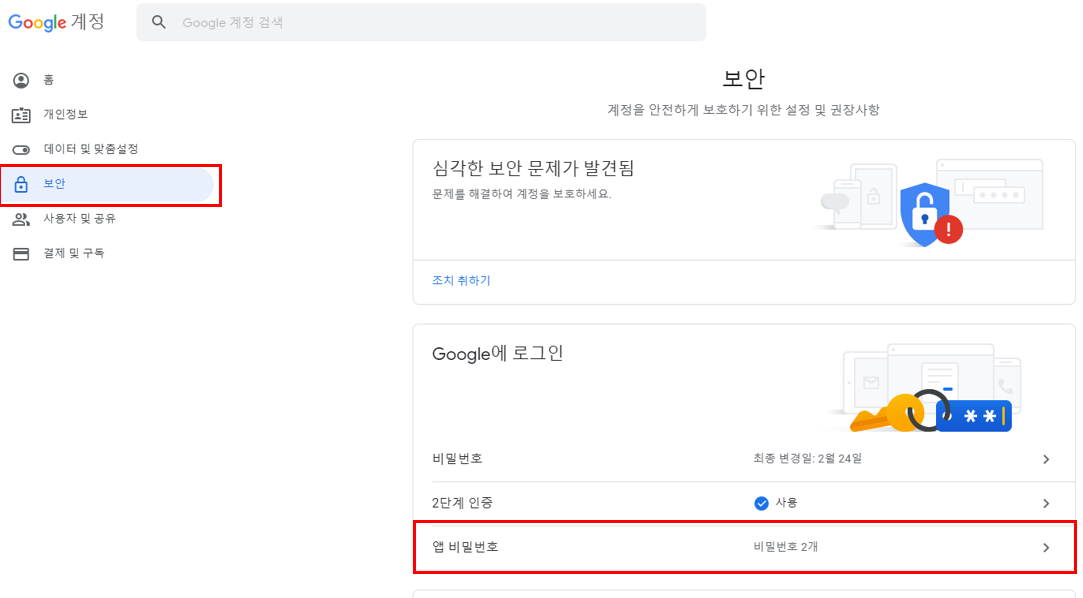 좌측 메뉴에서 '보안'을 선택하고 'Google에 로그인' 항목에 앱 비밀번호를 클릭합니다.