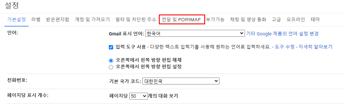 그럼 설정 페이지로 이동하게 되는데, 여기서 전달 및 POP/IMAP 항목을 클릭합니다.