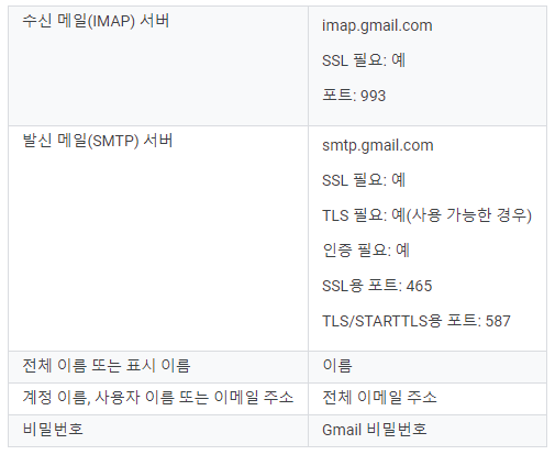 위 표는 Gmail의 smtp / imap 서버 접속 정보입니다.