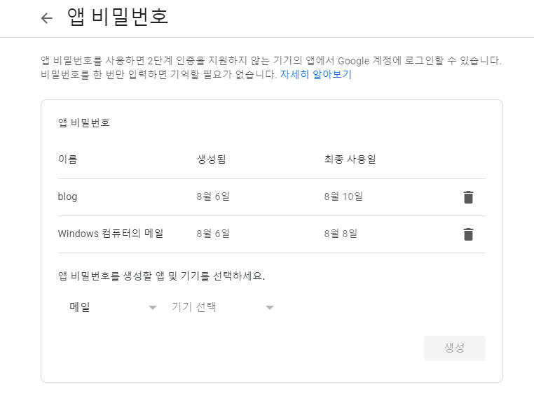 앱 비밀번호를 클릭하면 비밀번호를 요구하는데, 로그인하고 진행하면 아래와 같은 화면이 나옵니다.