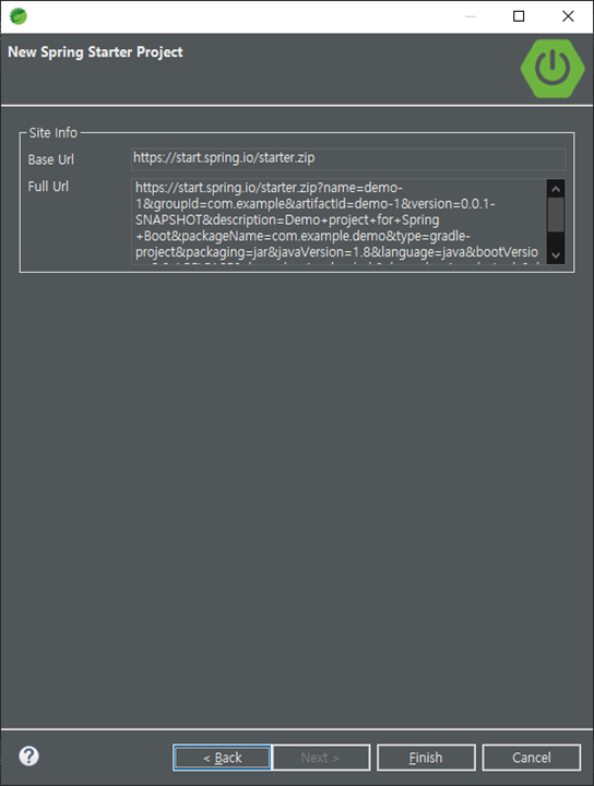 방금 설정한 정보들을 spring initializr로 보내서 설정이 적용된 프로젝트를 다운로드합니다.
