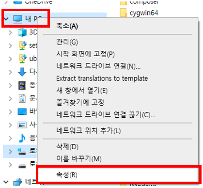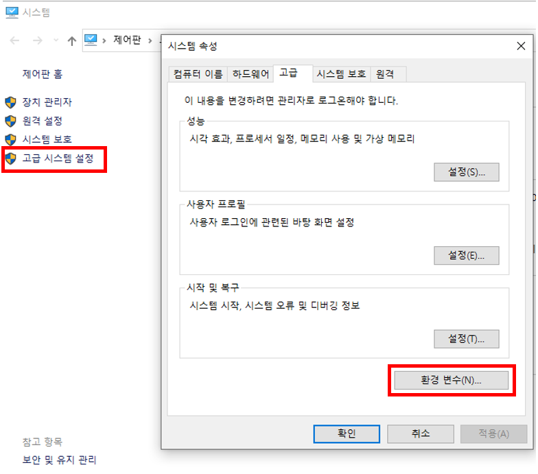고급 시스템 설정을 시스템 속성 창이 활성화되는데, 여기서 고급 탭의 환경 변수를 클릭합니다.