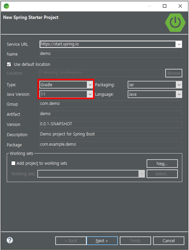 Type에서 Gradle을 선택하고 Java Version은 11을 선택합니다.