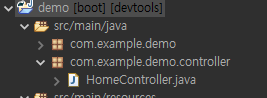 src/main/java 경로에 com.example.demo.controller 패키지를 생성하고 HomeController.java를 생성합니다.