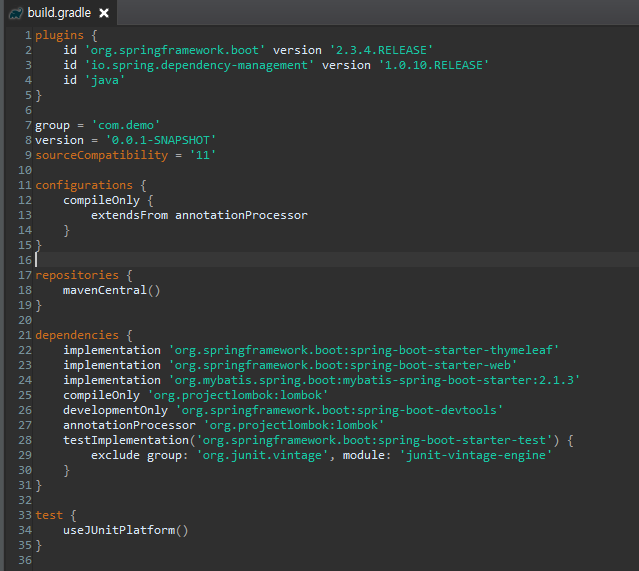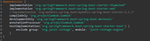 먼저, bundl.gradle 파일에서 mybatis 의존성을 주석 처리합니다.