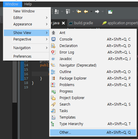 메뉴바에서 Window -> shw View -> Other 버튼을 누릅니다.