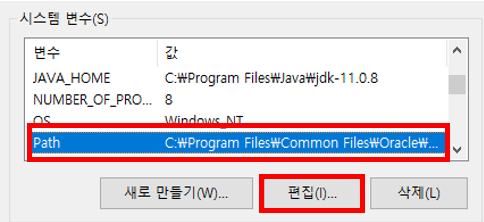 그리고 시스템 변수 중 Path 항목을 선택하고 편집 버튼을 누릅니다.