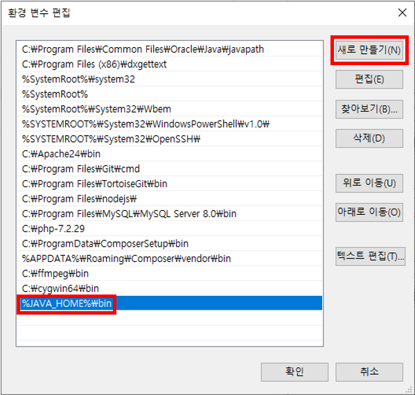 새로 만들기 버튼을 누르고 %JAVA_HOME%bin 값을 추가합니다.