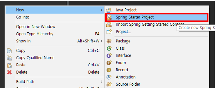 STS4 IDE를 실행하면 화면 좌측에 Package Explorer 탭에서 우클릭 -> New -> Spring Starter Project 버튼을 눌러 새 Spring Boot 프로젝트를 생성합니다.