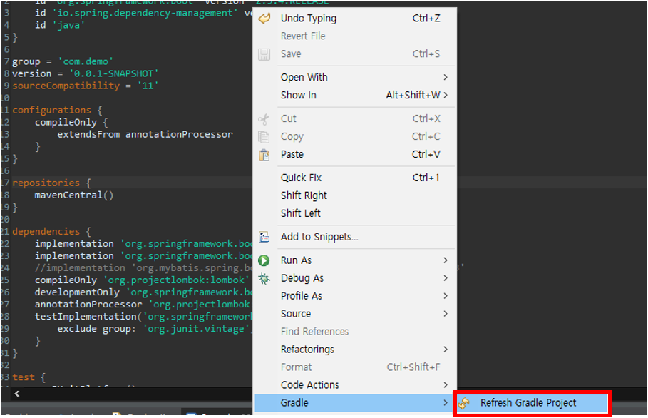 그리고, 소스코드 우클릭 -> Gradle -> Refresh Gradle Project 버튼을 눌러 의존성 변경 사항을 적용합니다.