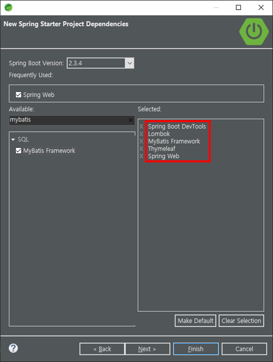 저는 Spring web, String Boot DevTools, Lombok, MyBatis Framework, Thymeleaf를 추가했습니다.
