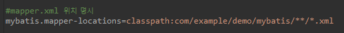 2번 항목에서 applications.properties 파일내 mapper-locations 설정을 com/example/demo/mybatis/**/*.xml로 정했습니다.