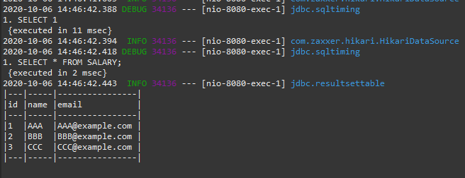 서버를 재시작하고 쿼리문을 요청하는 컨트롤러에 접근했을 때, 위와 같이 sqltiming, resultsettable 로그가 출력된다면 정상 적용된 것입니다.