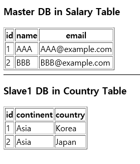 구분의 용이를 위해 마스터 DB의 테이블은 SALARY, 슬레이브 DB는 COUNTRY로 종류를 구분해 주었습니다.