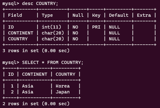 mysql> INSERT INTO COUNTRY VALUES (1,'Asia','Korea');