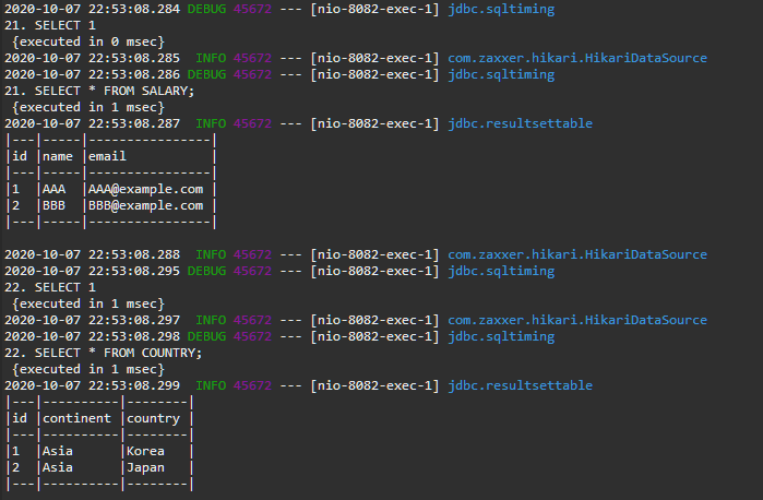 만약 log4jdbc를 적용한 프로젝트라면 아래와 같이 데이터 로그를 출력해 줄 것입니다.