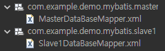mapper 인터페이스와 구분을 주기 위해 xml 파일들의 패키지는 mybatis를 상위 패키지로, master, slave1 패키지를 하위로 구성하고 master에는 MasterDataBaseMapper.xml 파일을, slave1에는 Slave1DataBaseMapper.xml을 생성합니다.