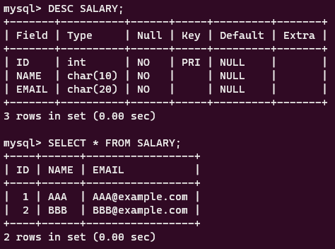 mysql> INSERT INTO SALARY VALUES (2,'BBB','BBB@example.com');