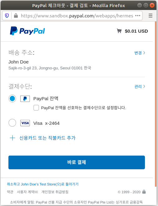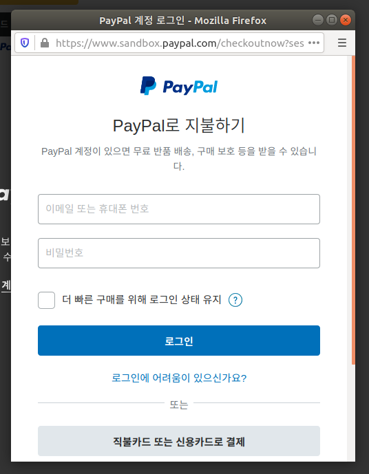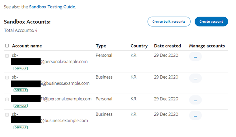 여기서 Personal 타입인 계정을 통해 결제 테스트를 진행하게 됩니다.
