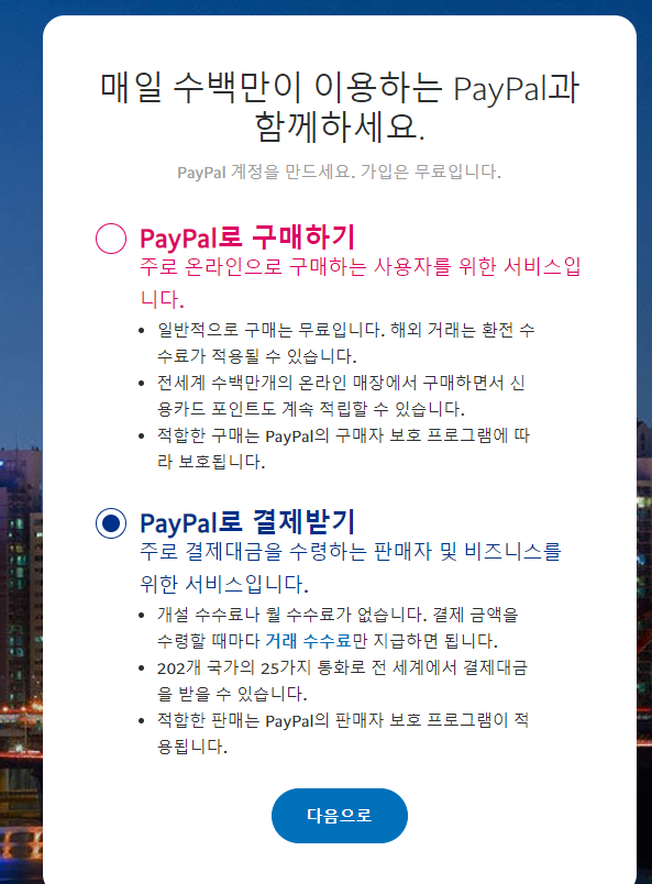 위 링크를 타고 PayPal에 계정을 생성합니다.