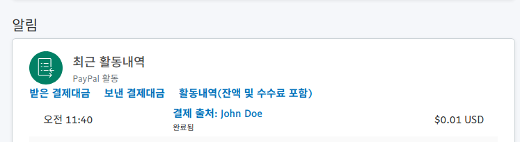 위와 같은 경우에는 사전에 사용자 정의로 선언한 PayPalException에 name과 message값을 적용하고 throw 문을 통해 onError 함수로 보내게 되며 결제는 중단됩니다.