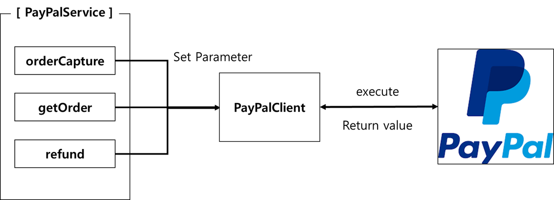 결제 승인, 결제 정보 획득, 환불 등 거래 종류별 함수를 관리할 PayPalService 클래스를 정의하고 각 요청 처리를 전담할 PayPalClient 클래스를 작성해 연결하는 것으로 명료하게 합니다.