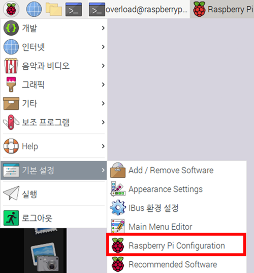 작업 표시줄에서 기본 설정 > Raspberry Pi Configuration을 엽니다. root 권한이 필요합니다.
